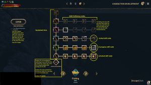 On the Character Development screen, you can see your progress in various skill progression trees. Press ['] (quote) to open the Character Development screen, or click the icon at the top of the map. Use the left and right arrows to scroll through the different skill trees. Progression on any tree begins from the bottom and goes upward.