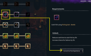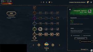 With Fishing, for example, experience is earned in the Breadball bait skill nodes each time you catch a fish with a Breadball bait. Experience toward unlocking the next tier of fishing rod is being earned at the same time. This means the skill nodes do not need to be maxed out horizontally before unlocking new tiers vertically.