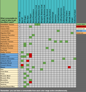 Below is a full list of all current alchemical items, effects, buff slots, and optimal dosages. Duration times may be affected by the Wenedian Witch Guild Technology, but that tech does NOT change the effects.