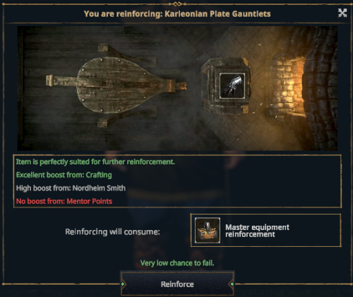 Newer players or non-crafters are recommended to seek out high level crafters with large mentor point pools for item reinforcement.