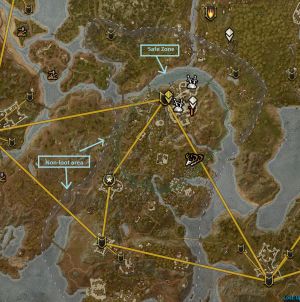 The lands closest to the capital cities are low risk areas. The capitals themselves are safe zones, which means players cannot be harmed in them. The areas surrounding the capital, where players do their starter quests, are non-loot zones. These areas are marked with dashed lines.